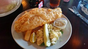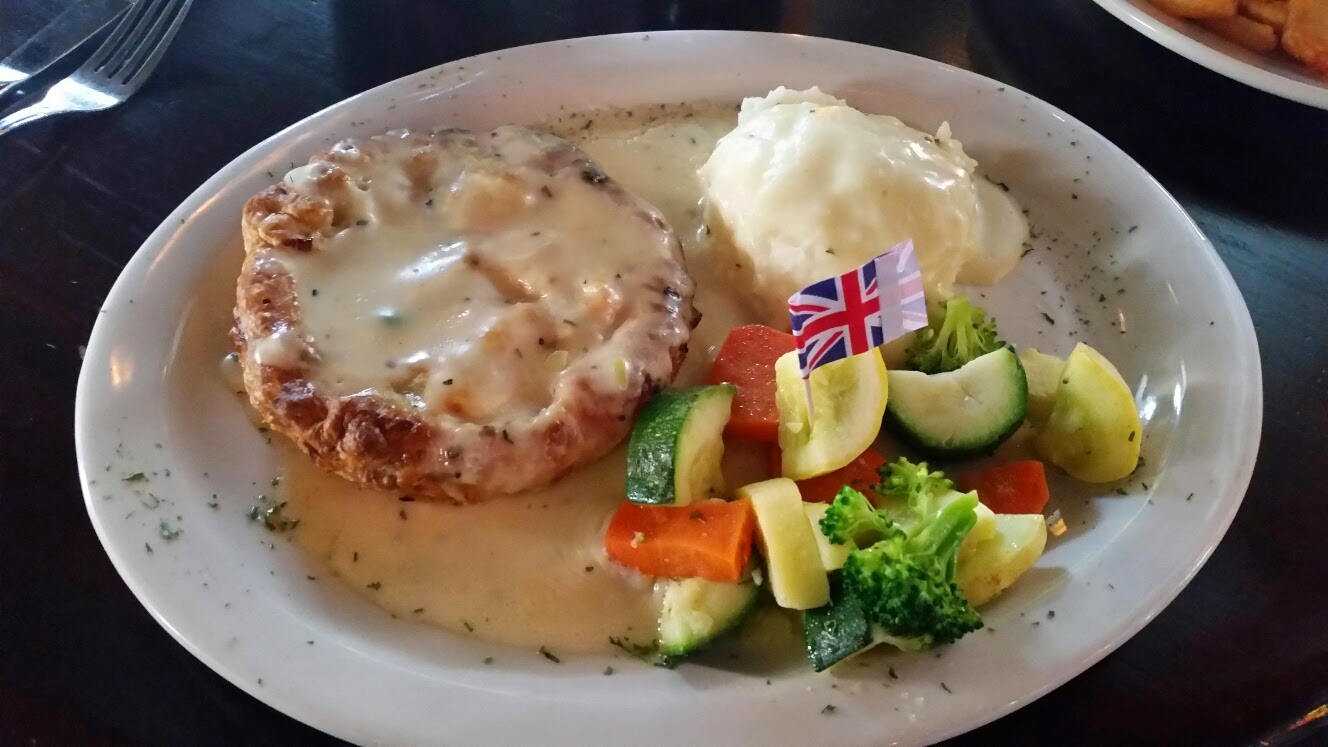 When we arrived only a few tables were taken, but unknown to us, a Chelsea vs. Manchester City soccer match was about to start and the place was buzzing with people within 15 minutes. We started with the Bubble & Squeak appetizer. This traditional English dish consists of mashed potatoes and sautéed brussel sprouts, but here they substituted cabbage. The dish had a great consistency and was very tasty. For our meal, my wife went with the Famous Southend Haddock N’ Chips and I took our waiter’s suggestion, the Chicken Pot Pie.