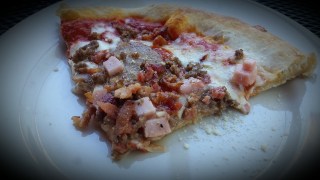 This pizza was loaded with meat (pepperoni, Italian sausage, beef, ham, bacon) and mozzarella. In each bite, I tasted all of the different meat flavors, and they all worked together. One thing we noticed, unlike other meat pies which tend to be greasy and heavy, this pizza was light with no greasy aftereffects.
