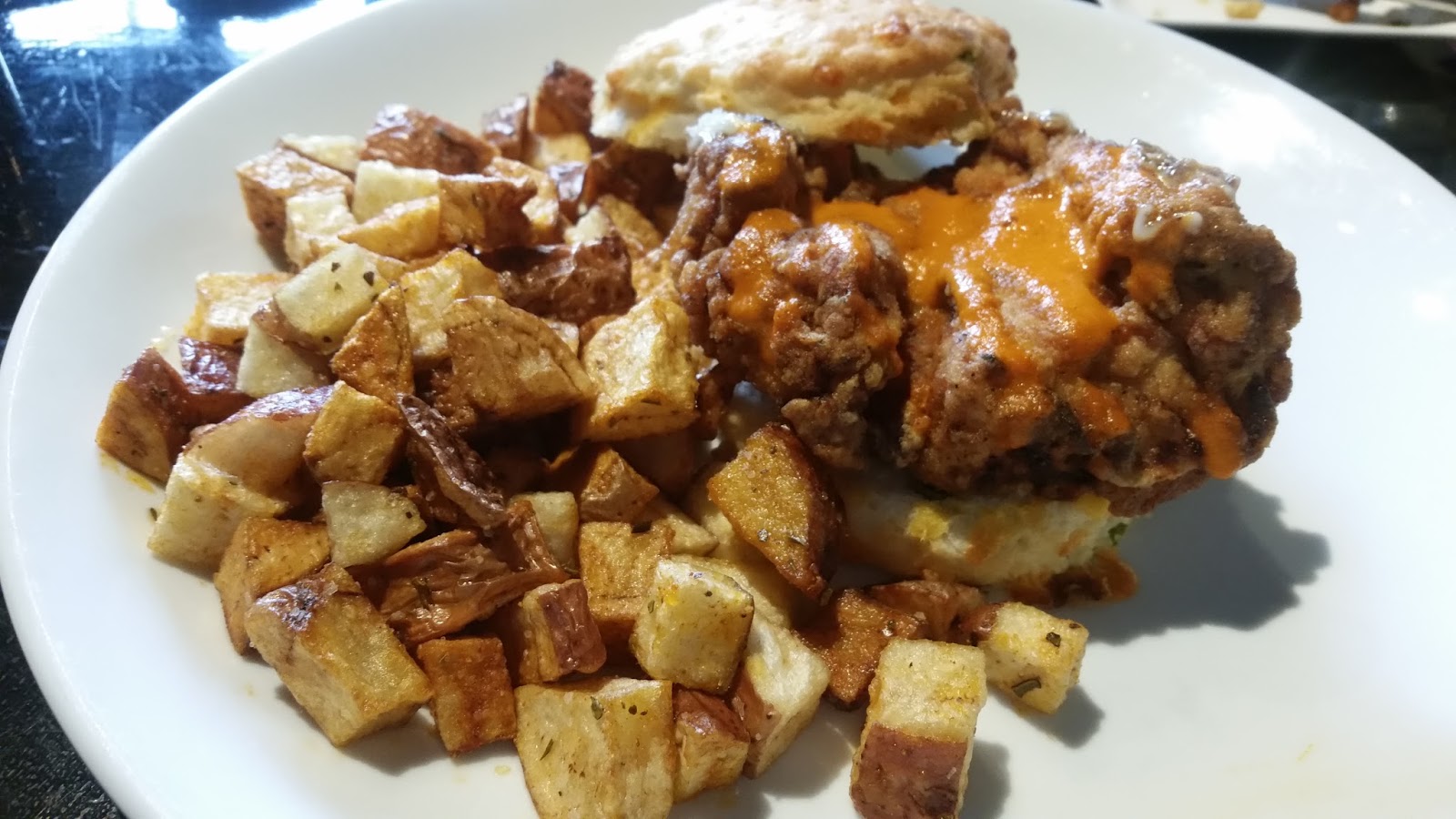 Dora here. I visited Peculiar Rabbit with a dear friend a few weeks ago, and I enjoyed it so much, I was anxious to bring Ernie back. The last time, I sampled the PR Burger. Awesome, btw, but this time I ordered the Chicken Biscuit. A giant cheddar biscuit with fried chicken breast, American cheese, hot sauce and mayo served with crispy breakfast potatoes. Yum! A tad spicy, which I like, but I preferred to eat the chicken and biscuit separately. The breakfast potatoes were tasty with the perfect amount of seasoning. I wanted to cry that I had to leave some on my plate. Maybe the next time we’ll check out that rooftop deck. 🙂