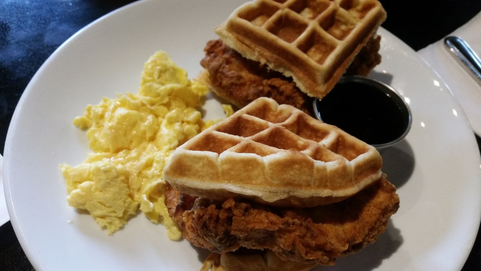 The Chicken and Waffles dish was huge! Chicken battered in 12 Herbs and Spices, malted milk waffles, Vermont maple syrup and two soft scrambled eggs. The eggs and waffle took a back seat to the fried chicken. Crispy, tender and moist. Outstanding!