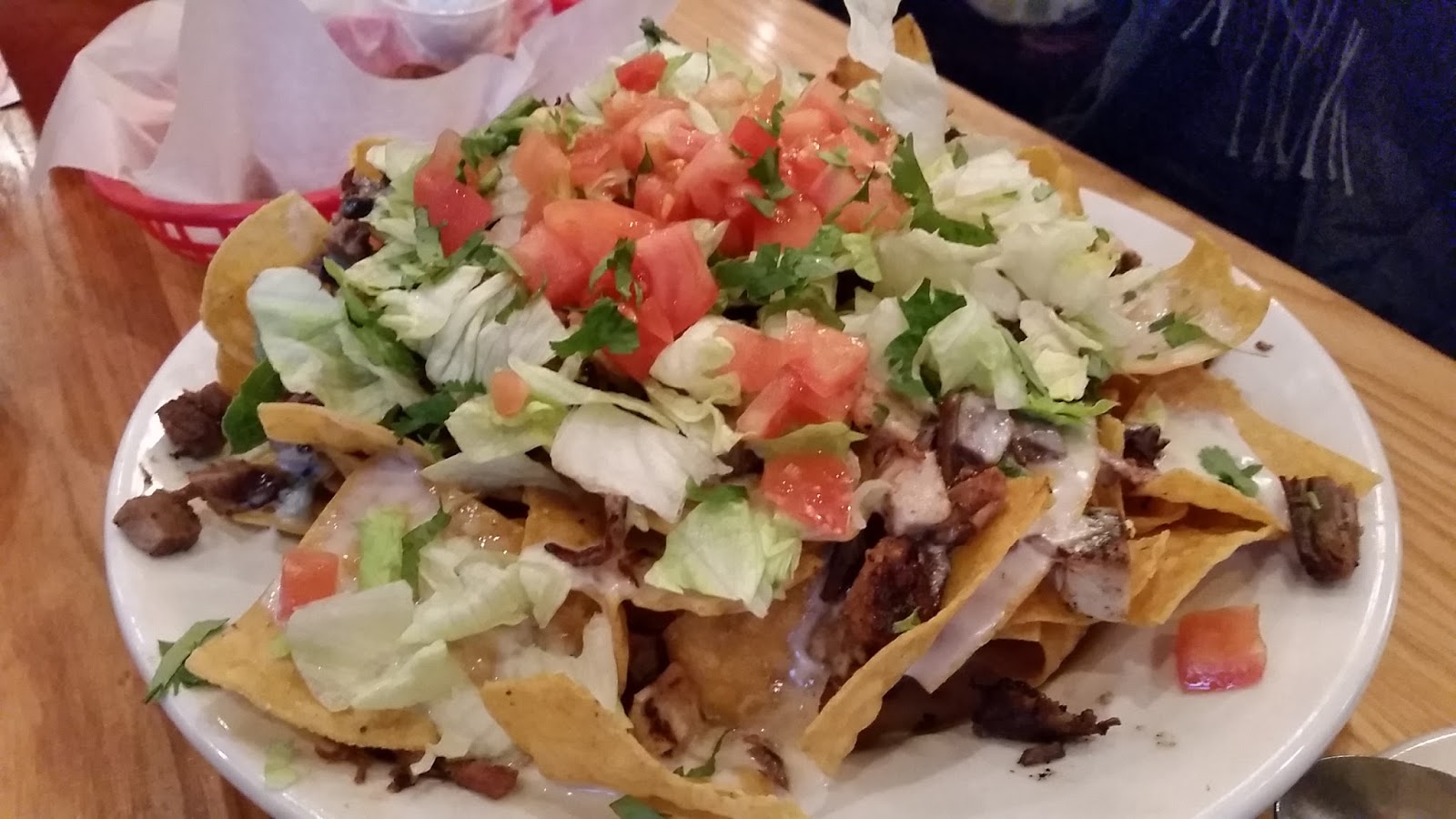 The Carolina Classic Nachos was loaded with three types of meat (pulled pork, smoked chicken and brisket), lettuce, tomato and chips.