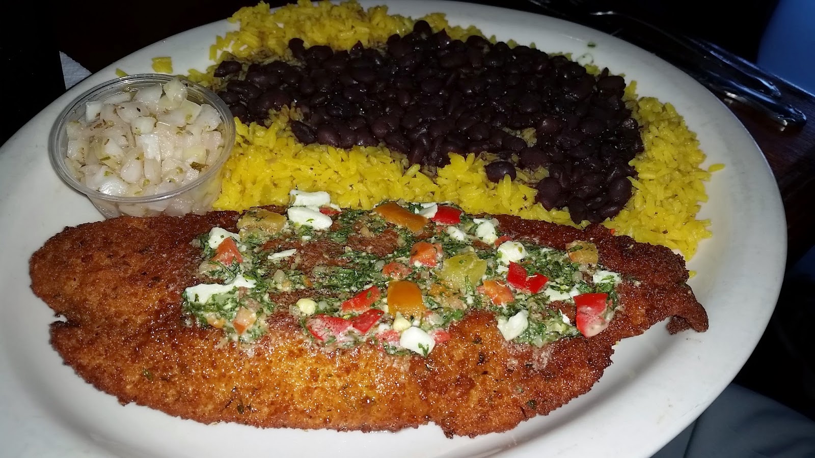I chose the Pescado a la Rusa, whitefish filets, fried and topped with a Russian-style sauce (butter, parsley and hard-boiled eggs), complemented with yellow rice and black beans. The fish was tender and flaky, and paired perfectly with the sauce.